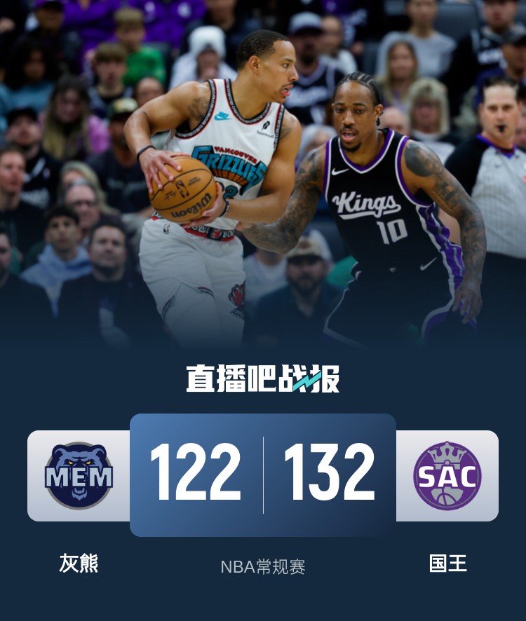 比赛开始,双方上来展开拉锯战,灰熊全民皆兵,德罗赞和蒙克联手串联起球队进攻,随后国王发力一波10-0建立领先,首节国王领先11分,次节双方继续拉锯战,国王始终保持10分左右领先,贝恩苦苦支撑,拉文里突外投单节上双,次节双方打成28平。下半场,双方展开对攻战,贝恩外线连中4记三分怒轰16分,但国王多点开花给出回应,贝恩继续保持火热手感,三节国王还是保持12分领先,末节拉拉维亚和蒙克、拉文连续4记三分直接拉开20分以上领先,康查尔和贝恩连续三分止血,但国王还是保持住十几分领先,最终国王132-122击退灰熊,终止4连败。