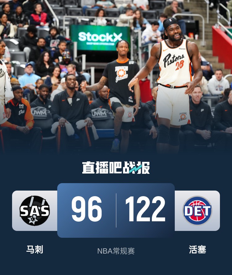 上半场,双方开场均表现慢热,连续打铁失误,得分非常困难,活塞率先发力多点开花取得领先,次节马刺完全哑火,活塞全民皆兵一举将优势扩大到20分以上,瓦塞尔拿分苦苦支撑,半场战罢活塞60-34领先马刺。下半场,卡斯尔突然发力,单节6中6独得13分率队迫近比分,活塞内外开花稳住局势,末节活塞稳扎稳打保持优势,马刺换下主力投子认负。最终,活塞122-96轻取马刺,客场过关。