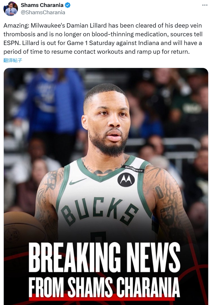 Shams称,利拉德目前将会缺席雄鹿VS步行者的G1,他将会用一段时间来逐步恢复对抗训练,并为复出做准备!
