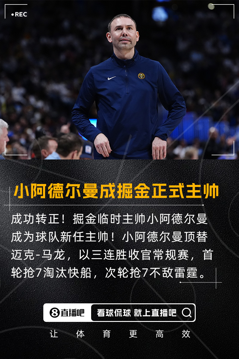 05月23日讯 据ESPN名记Shams Charania报道,多位消息人士透露,掘金和临时主帅小阿德尔曼达成协议,后者正式成为球队下一任主教练。随后,掘金官方宣布小阿德尔曼成为球队新任主教练。