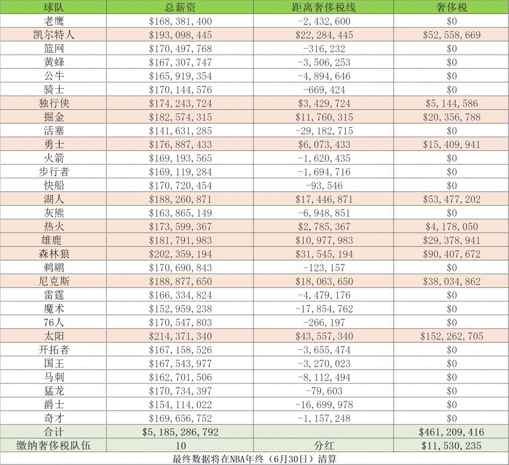 太阳1.52亿领衔10支奢侈税球队️其余每队分红1140万