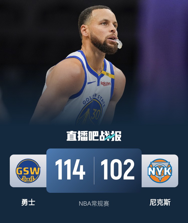 开场后勇士外线两记三分率先取得领先,尼克斯不断冲击内线追上比分,随后两队陷入僵持,场上比分也是交替上升。第二节上来尼克斯率先外线开火建立领先,勇士外线手感不佳频频打铁,布伦森接连砍分帮助尼克斯将分差拉大到两位数。易边再战,巴特勒上来连续扣篮吹起勇士反击号角,随后库里发力带队完成反超,但库里下场休息后尼克斯一波8-0夺回领先,希尔德命中三分帮助勇士1分优势结束第三节。末节上来两队依旧打得十分胶着,尼克斯始终紧咬比分,库里重新登场后率队打出一波11-0将领先扩大到两位数。布伦森上篮打进止血,但此后勇士打得依旧稳健,最终勇士114-102击败尼克斯取得2连胜,尼克斯3连胜被终结。