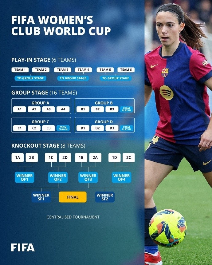 女足世俱杯具体的赛制方面,19个参赛名额分为13个小组赛名额以及6个分组资格赛名额,亚足联、非洲足联、中北美及加勒比海足联和南美足联各有两个小组赛名额,欧足联则有五个小组赛名额,分组资格赛名额则六大足联各有1个。女足世俱杯分为三个阶段,首先是分组资格赛阶段(play-in),6支球队分三组进行单回合淘汰赛,决出3个晋级小组赛的名额。随后是16支球队(13支小组赛球队+3支分组资格赛胜者)组成的小组赛阶段,16队分为四组,每组前两名球队晋级淘汰赛。淘汰赛阶段有8支球队参加,采取单回合淘汰赛赛制。