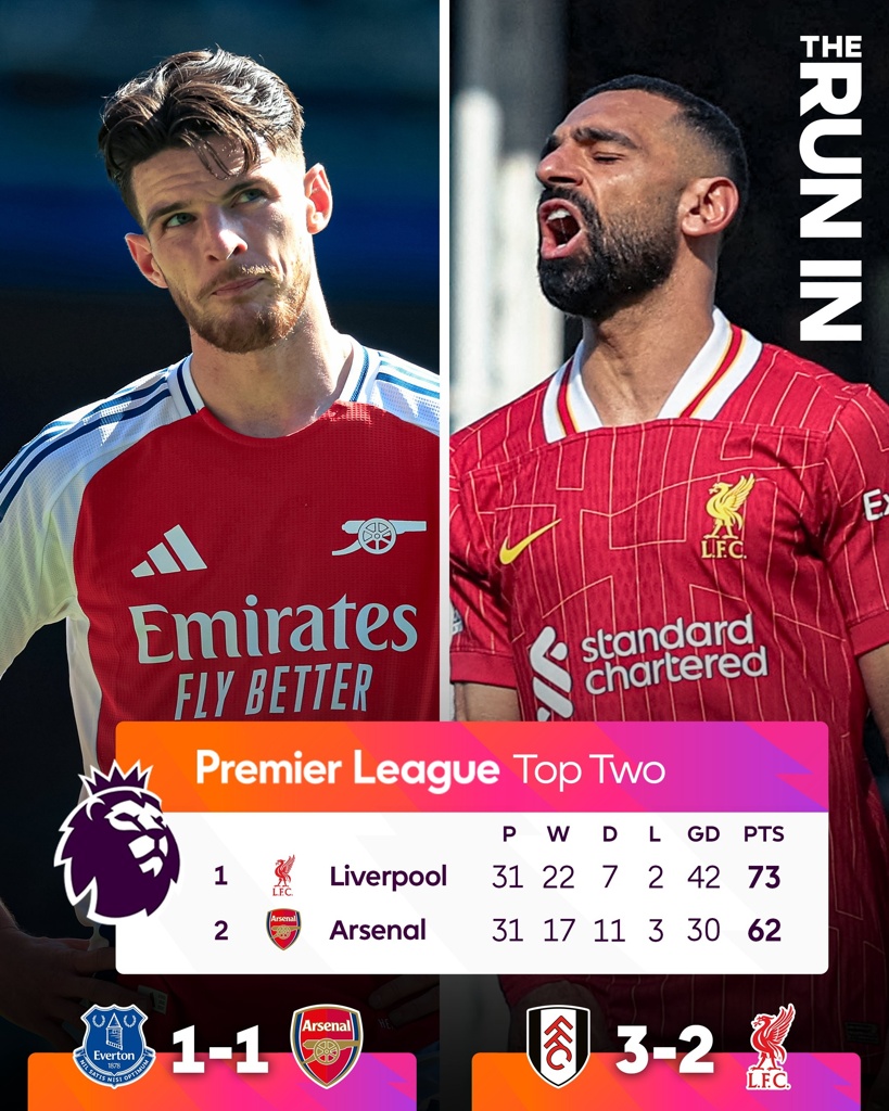 04月07日讯 英超第31轮比赛结束多场,本轮积分榜前二的利物浦和阿森纳都丢分,在联赛还剩7轮的情况下,利物浦仍有11分的领先优势。