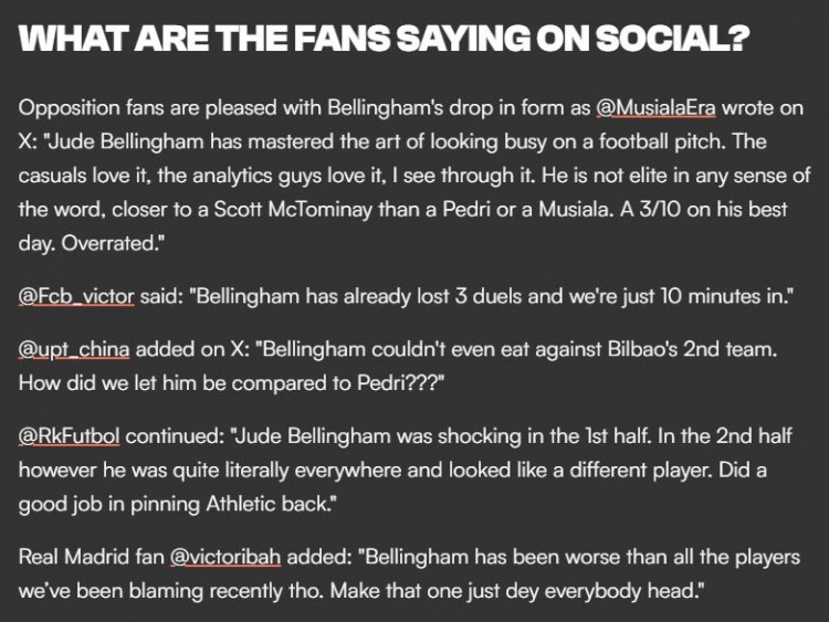 MusialaEra:贝林厄姆已经掌握了如何在比赛中存在感十足的艺术,普通球迷爱看他,数据党也喜欢他,我算是看穿了。从任何角度来说贝林厄姆都不是精英级球员,他更像是麦克托米奈那一类型,而非佩德里和穆西亚拉那种,他发挥最好的一天也就是这两位球员的3/10而已,贝林厄姆被高估了。
