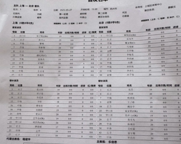 替补:2-张昊、4-冯博、7-杨泽祖、9-王子皓、18-戴金宇、22-栾家铭(GK)、24-范泽文(GK)、26-黄非凡、28-陈博弈、36-吴松霖、42-曾宇翔、77-程浩伦