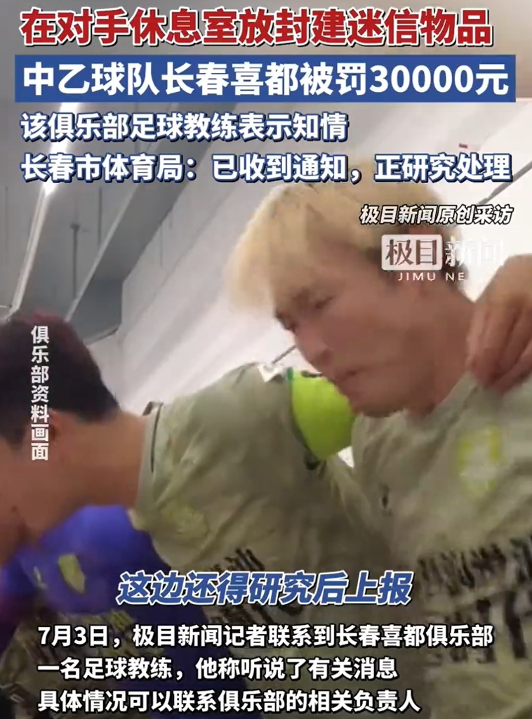 7月3日讯 7月2日晚间,中足联官方发布公告,对长春喜都俱乐部在客队休息室放置封建迷信物品的行为进行处罚,通报批评并罚款3万元。对于长春喜都迷信行为,极目新闻撰文认为,想靠玄学赢球才真是脸都不要了!