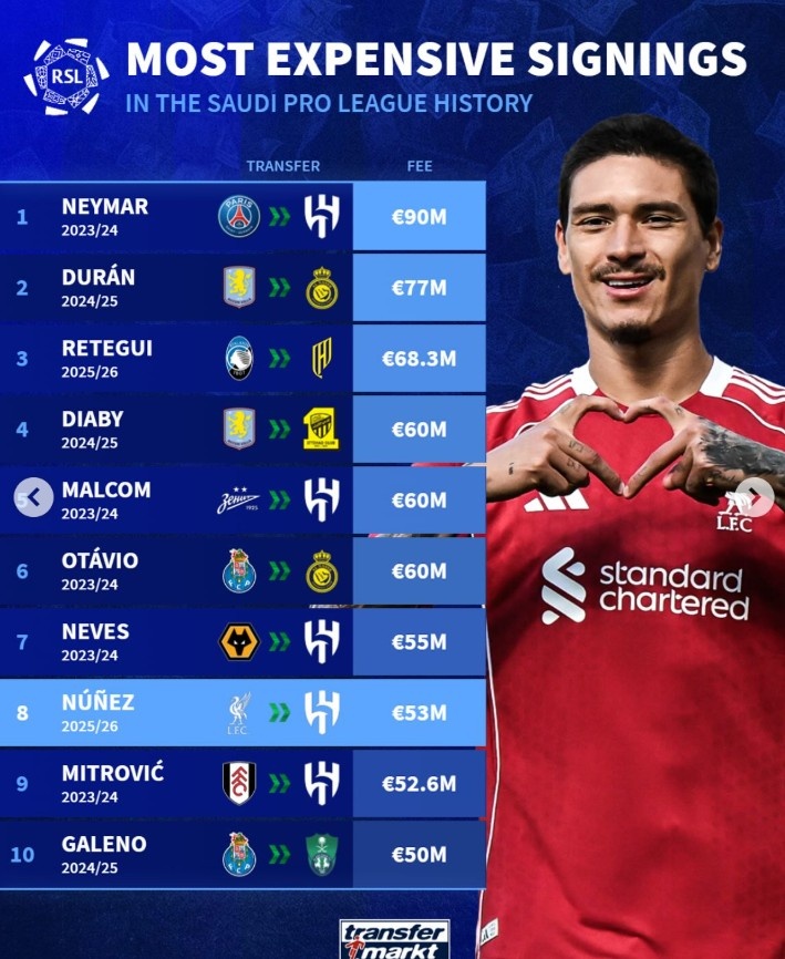 8月10日讯 努涅斯正式以5300万欧+1200万欧的身价加盟利雅得新月,据德国转会市场网统计,这笔交易排在沙特引援转会费排行榜的第8名。