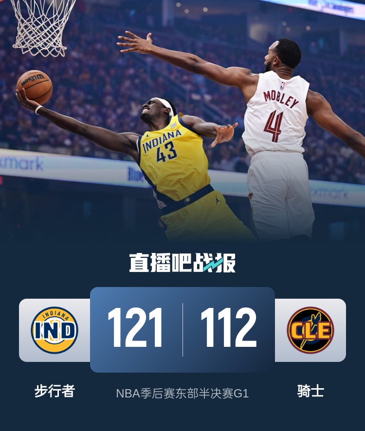 比赛开始,双方上来就展开对攻,米切尔里突外投撑起进攻,西亚卡姆强势回应很快上双,步行者连续三分建立领先,最后3分钟步行者轰出10-0领先到11分,次节小莫布里连续攻击篮下追分,但步行者各种转换还是稳住领先,双方展开拉锯战,内姆哈德连续三分助步行者半场保持6分领先。下半场,骑士攻击内线追分,但内姆哈德和内史密斯连续3记三分重新拉开双位数领先,但随后米切尔连续反击造杀伤带领骑士20-4攻击波一度反超比分,末节双方展开胶着拉锯战,内姆哈德继续保持外线神准,步行者连续4记三分再次建立主动权,骑士外线始终不开,哈利伯顿上篮杀死比赛,最终步行者121-112力克骑士,拿到开门红。
