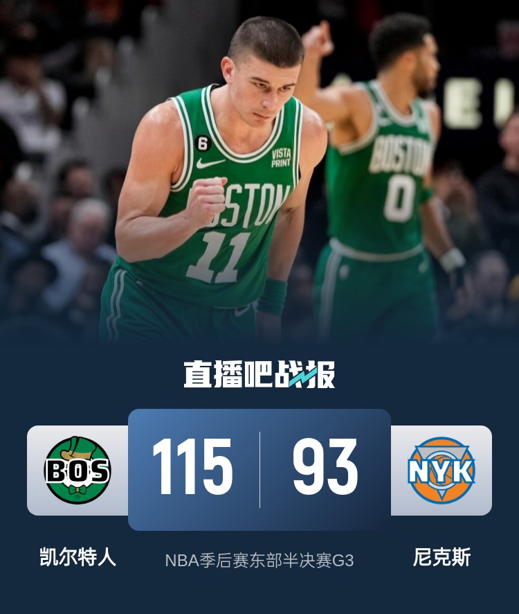 5月11日讯 NBA季后赛东部半决赛G3,凯尔特人客场挑战尼克斯,目前大比分凯尔特人0-2落后。
