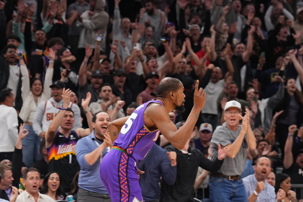 2024-25赛季,36岁的杜兰特为太阳出战62场常规赛,场均上场36.5分钟可以砍下26.6分6篮板4.2助攻0.8抢断1.2盖帽,三项命中率分别是52.7%、43.0%和83.9%。