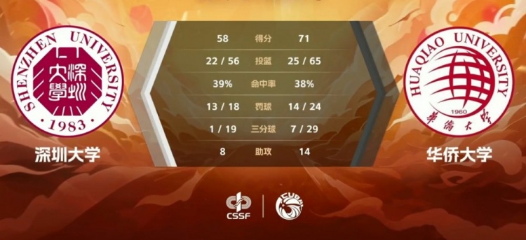 末节决战,两队上来都成功率不太高,叶润峰连进两球打破僵局,深圳大学也冲击内线回应,叶润峰和张高铭外线连续三记三分帮助华侨大学拉开比分,深圳未能再追上比分,最终华侨大学71-58击败深圳大学。