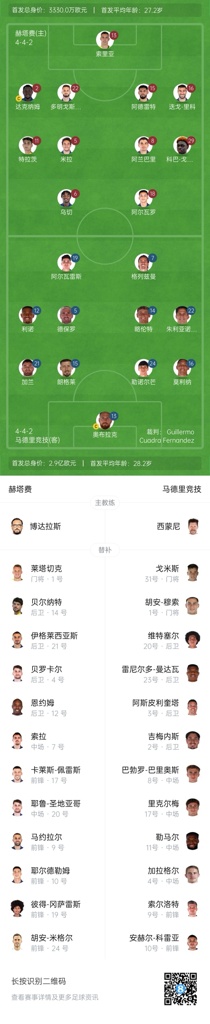 赫塔费首发:13-索里亚、2-杰内、5-米拉、6-乌切、8-阿兰巴里、11-特拉茨、15-阿尔德雷特、16-里科、18-阿尔瓦罗-罗德里格斯、22-多明戈斯-杜阿尔特、29-科巴-达科斯塔