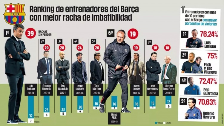 3月29日讯 巴萨在西甲补赛3-0完胜奥萨苏纳,延续了弗里克带队的出色表现,《每体》统计显示弗里克是巴萨队史主帅连续不败榜第6,并且总胜率仅次于恩里克。