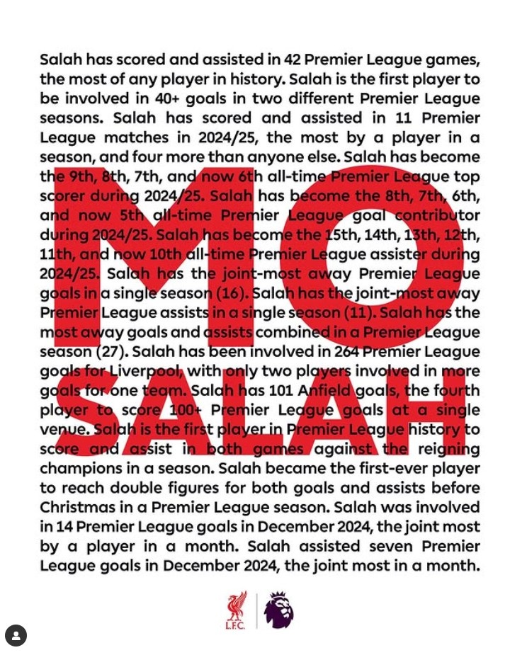 2月25日讯 萨拉赫本赛季英超27场比赛,贡献了25粒进球和16次助攻。英超官方盘点了萨拉赫在本赛季英超过程中创造的的纪录或达成的里程碑时刻。