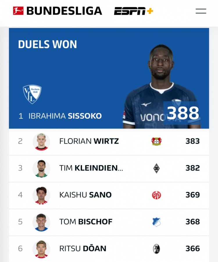 据日本博主“Japan Soccer Fan”援引德甲官方数据统计,在德甲联赛官方公布的对抗成功数统计中,佐野海舟和堂安律也都在榜,其中佐野海舟以369次成功对抗排在联赛第4位,堂安律也是以366次位列第6位。
