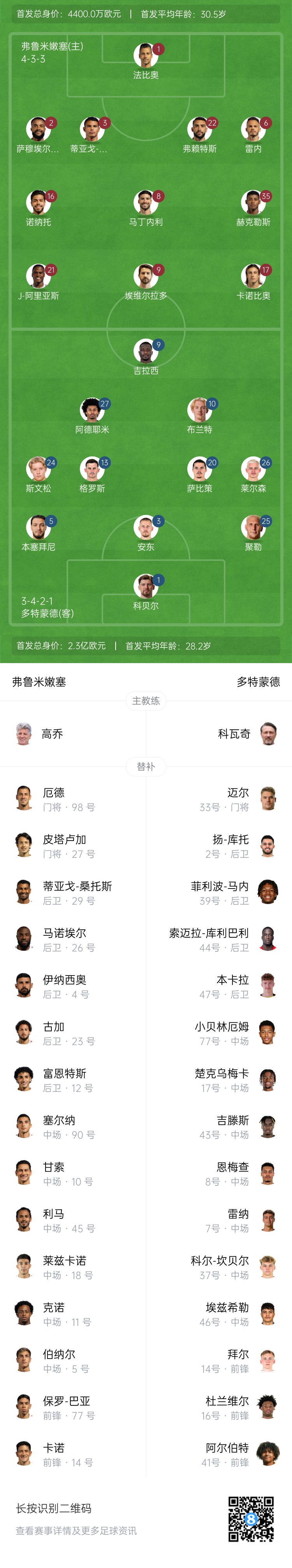 弗鲁米嫩塞替补:27-皮塔卢加、98-厄德、4-伊纳西奥、12-富恩特斯、23-古加、26-马诺埃尔、29-蒂亚戈-桑托斯、5-伯纳尔、10-甘索、18-莱兹卡诺、45-利马、11-克诺、14-卡诺、77-保罗-巴亚、90-塞尔纳